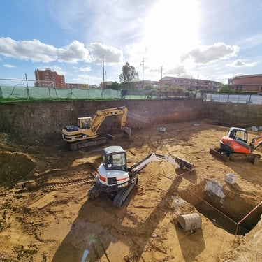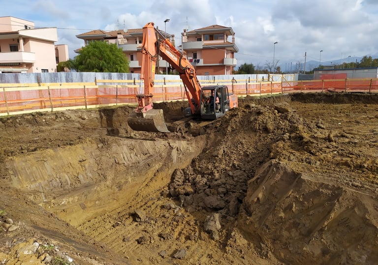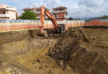 Sbancamenti, scavi a sezione obbligata, preparazioni aree esterne e opere di urbanizzazione.
