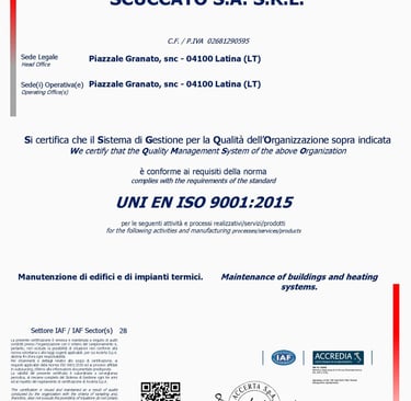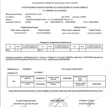 SOA OG1 – IV categoria (edifici civili e industriali) - SOA OG11 – I categoria (impianti tecnologici) - ISO 9001 – Qualità dei processi